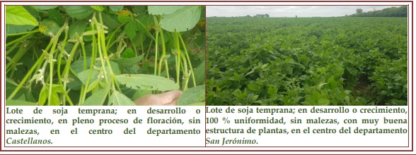 Además, como consecuencia de las situaciones climáticas acaecidas y ante la imposibilidad de la realización de las aplicaciones indispensables, aumentó el número de malezas, especialmente Amaranthus quitensis (yuyo colorado) y Sorghum halepense (sorgo de alepo), en las diferentes parcelas, cuestión que debería resolverse en los próximos días, a medida que los pisos lo permitan y mejore su transitabilidad. Se detectaron, los siguientes estapas fenológicas: V “estados vegetativos”, V5 (5º nudo), V6 (6º nudo), V7 (7º nudo), V8 (8º nudo), V9 (9º nudo), R “estados reproductivos), R1 (inicio de floración) y lotes más avanzados, en R2 (floración con uno de los nudos superiores con hojas desarrolladas).