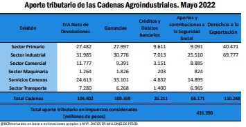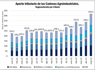 En total, en los primeros cinco meses del año, estimamos un aporte tributario por parte de las Cadenas Agroindustriales al Estado Nacional en torno a $ 1,6 billones de pesos, creciendo 50% en términos interanuales.