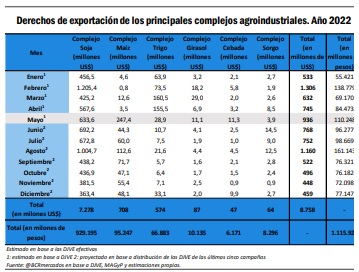 La estimación del aporte anual en D.E.X. cae en unos US$ 300.000 entre meses, principalmente por un ajuste a la baja en los precios estimados de exportación de los productos del complejo soja, y un ajuste en los volúmenes proyectados de DJVE. Actualmente, el aporte anual en D.E.X. de los complejos agroindustriales se estima en US$ 8.758 millones de dólares o unos $ 1,15 billones de pesos