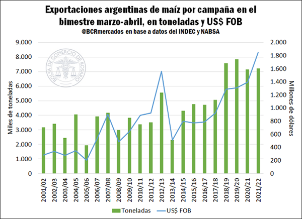 Las exportaciones del primer bimestre de la cosecha 2021/22 de maíz fueron de US$ 1.805 millones, superando el anterior récord del 2013 en US$ 290 millones. Además, las exportaciones del Complejo Soja en abril son el segundo mayor registro histórico.