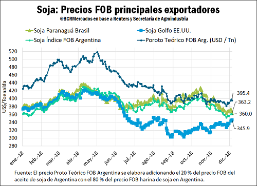 Ya se venía observado en el último mes este comportamiento, lo que se interpretaba como una señal donde los mercados FOB descontaban la posibilidad de una tregua comercial entre ambas potencias en la reunión del G-20 en Argentina. En este cambio de precios se evidenció en una caída en los precios FOB tanto de Brasil como de Argentina, mientras que los precios negociados por la soja de Estados Unidos se recuperaron, consecuentemente disminuyendo la diferencia de precios entre la soja sudamericana y la estadounidense.