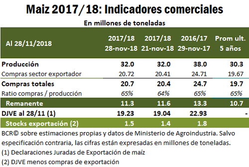 Según se desprende de los datos publicados por la Secretaría de Agroindustria, el avance de los negocios por el cereal está marcando un ritmo similar a la performance registrada en campañas pasadas, tanto para la negociación de los forwards a cosecha como el maíz remanente de la campaña anterior. En este sentido, los negocios de exportación han acompañado este ritmo de compras de campañas pasadas, efectivamente limitados por la menor producción de la campaña actual. Las compras de maíz por parte del sector exportador alcanzan 20,72 Mt, mientras que las DJVE a la misma fecha acumulan 19.23 Mt. Reflejando el buen volumen de negocios de exportación, según fuentes del mercado esta semana, la ONAB de Argelia compró una carga de maíz de 40.000 toneladas en su última licitación a USD 204,4/t CIF proveniente de nuestro país en un momento atípico por el momento del año en que se realizó el negocio. Mientras avanzan los días, los stocks de maíz 17/18 sin comercializar se hacen más escasos acaparando más atención de negocios el maíz 18/19.