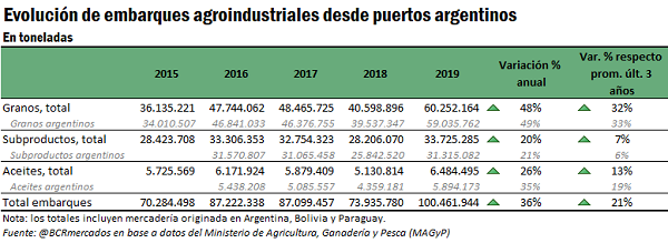 Los embarques de granos, subproductos y aceites superaron la marca de 100 millones de toneladas en 2019