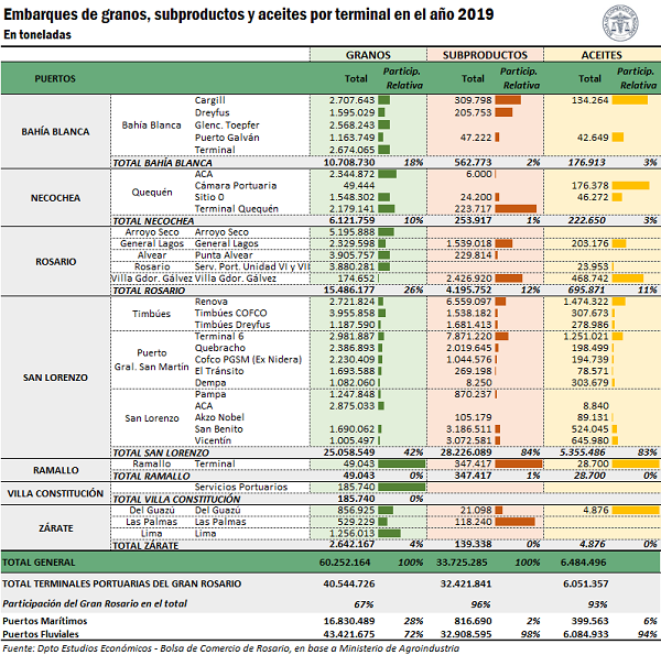 Las terminales portuarias del Gran Rosario son las que mayor participación tienen en el total. San Lorenzo/Pto Gral San Martín (que agrupa Timbúes, Puerto General San Martín y San Lorenzo) y Rosario (que contiene los puertos de Arroyo Seco, General Lagos, Alvear, Rosario y Villa Gobernador Gálvez) dieron cuenta del 67% de los embarques de granos, el 96% de subproductos 93% de aceites en 2019.