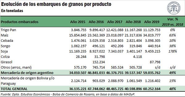 La extraordinaria recuperación productiva tras la sequía de 2018, permitió al país embarcar el volumen de granos más alto de su historia por un total de 60.252.164 toneladas. Se computan en este indicador la suma de los despachos de los siguientes granos: trigo, maíz, soja, sorgo, cebada, y girasol, en base a información oficial provista por el Ministerio de Agricultura, Ganadería y Pesca de la Nación. Este volumen resulta un 50% superior a los embarques del año 2018, pero también un 25% mayor el registro promedio de los años 2016 y 2017. Si se lo compara con el 2015, el salto alcanza el 70%.