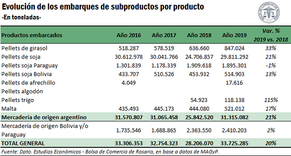 Subproductos: el crecimiento de los despachos de pellets de soja, girasol, trigo y malta permitió alcanzar un volumen récord de embarques, 21% superior a 2018.