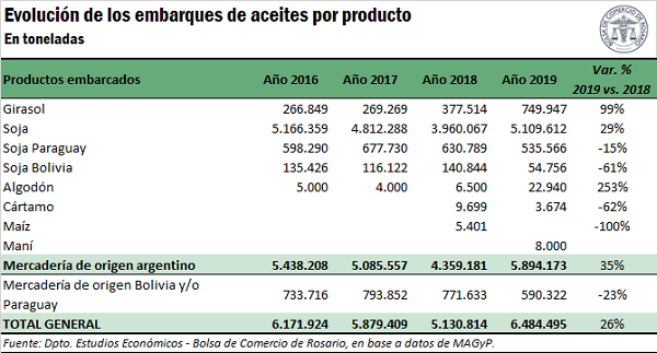 En el rubro de los aceites vegetales, los embarques externos durante 2019 alcanzaron 6.484.495 toneladas. Este monto implica un aumento del 26% con respecto al año anterior, que equivale a 1.353.682 toneladas, y el valor más alto de los últimos años ubicándose un 13% por encima del promedio de los anteriores 3 años. La cifra computa los despachos de aceite de soja (de origen argentino, paraguayo y boliviano), girasol, algodón, cártamo y maní.
