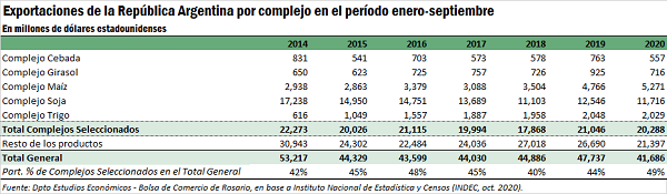 En los primeros nueve meses de 2020, las exportaciones de los principales complejos agroindustriales alcanzaron 70,5 Mt, el tercer volumen más alto después de los años 2019 y 2016. A este total se arriba considerando conjuntamente las exportaciones de cebada, girasol, maíz, soja y trigo en grano, así como sus principales productos derivados, incluyendo harinas, pellets, aceites, etc.