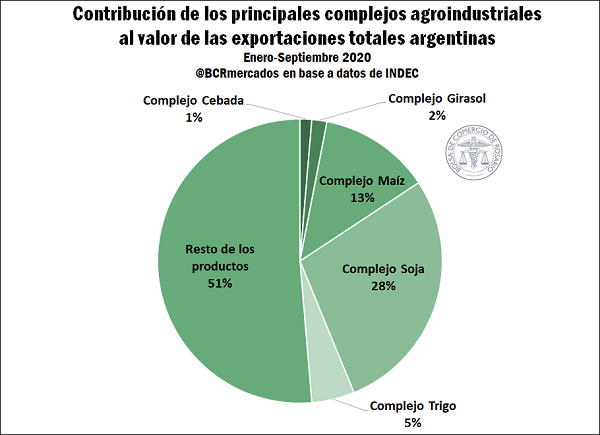 Analizando ahora valor de estos despachos, se tiene que las 5 cadenas explicaron conjuntamente el 49% de las exportaciones totales de la República Argentina entre enero y septiembre de 2020, el ratio más alto en al menos 7 años. Esta participación está 5 puntos porcentuales por encima de la proporción del año pasado, y un punto por encima del 2016, de los mejores años para las cosechas agrícolas.