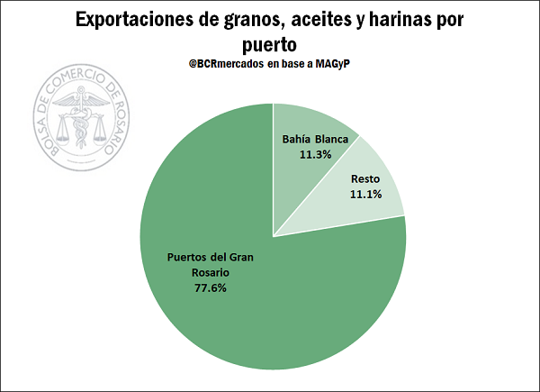 Asimismo, vale la pena destacar que del conjunto de las exportaciones agrícolas una gran mayoría es embarcada desde los puertos del Gran Rosario. Considerando los datos sobre el total exportado y los puertos de origen de estas exportaciones, se concluye que de cada 100 dólares que ingresaron al país por exportaciones, US$ 38 se originaron en embarques desde las terminales fluviales del Gran Rosario.