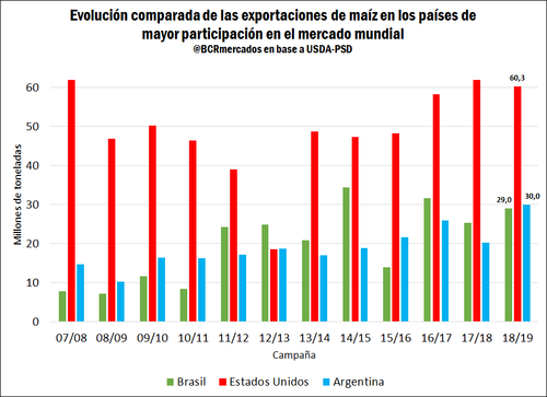 El maíz se mantiene en el centro de la escena en el mercado local, acaparando la demanda del sector exportador y con aumentos en las proyecciones de rindes y producción. Con expectativas de una excelente performance exportadora en la campaña que empezó el 1ro de marzo, el último informe de estimaciones de oferta y demanda del Departamento de Agricultura de Estados Unidos (USDA) ratificó la proyección de exportaciones récord. Según el mismo, nuestro país despacharía nada menos que 30 millones de toneladas (Mt) en el ciclo 2018/19, el mayor volumen de la historia. Esto volvería a ubicar a la Argentina como segundo máximo exportador mundial de maíz, por detrás de Estados Unidos y superando a Brasil.