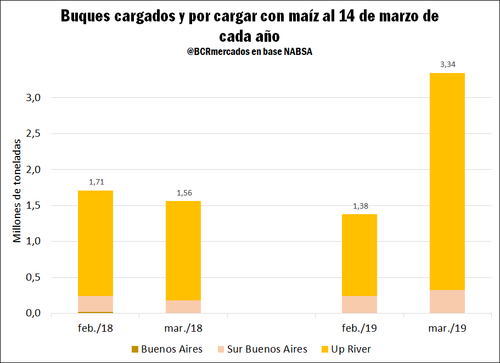 Se prevé una gran campaña para las exportaciones de maíz argentino, que volverían a ocupar el 2° lugar del ranking mundial con un récord de 30 Mt. Según las DJVE, se exportarían en marzo más de 4 Mt, mientras que a la fecha las cargas programadas de buques duplican las del 2018 con 3, 34 Mt.