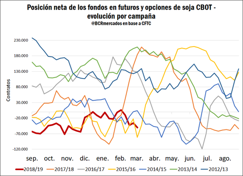 Como se puede ver el gráfico adjunto, los fondos mantienen la posición vendida más grande desde la campaña 2015/16 para este momento de la campaña, en donde se comienzan a definir las perspectivas de siembra en los Estados Unidos. Incluso se espera, según las estimaciones de Reuters, sea aún mayor ya que los fondos de inversión habrían vendido a partir del 6 de marzo unos 36 mil contratos de futuros de soja.