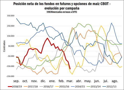 Para el caso del maíz, los “Money Managers” incrementaron su posición vendida neta en 72.318 contratos de futuros y opciones para alcanzar 176.777 en la semana finalizada el 5 de marzo, es decir, que mantienen una posición neta vendida por unas 22,5 millones de toneladas de maíz. En las últimas cuatro semanas los fondos revirtieron su posicionamiento con una venta acumulada de 191.147 contratos (más de 24 millones de toneladas), la más grande para un período similar desde las cuatro correspondientes al mes de junio pasado.
