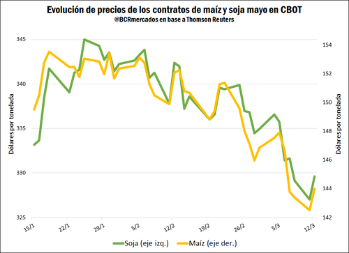El jueves catorce los fondos habrían hecho una importante cobertura de sus posiciones vendidas en maíz, comprando 17 mil contratos de futuros, debido a las complicaciones que podrían hacer que los agricultores disminuyen el área que destinan al cultivo de maíz. Esto hizo que los precios en Chicago suban en los últimos días. El contrato marzo, el de mayor volumen operado, alcanzó el mínimo desde que ha sido listado el lunes en US$ 142,51/t y desde allí comenzó a recuperarse para ajustar en US$ 145,76/t el día de ayer (14/3). La soja también comenzó a recuperarse después de tocar un mínimo de más de tres meses en US$ 327,02/t el lunes pasado y tras una leve recaída el jueves cerró en US$ 330,14/t