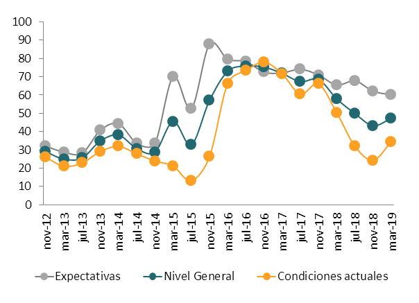 El índice que considera sólo empresas que desarrollan la actividad agrícola fue de 47.3 en marzo pasado, valor que se encuentra 4.1 puntos por encima de noviembre de 2018, pero 10.6 puntos por debajo de marzo de ese mismo año (ver gráfico 2). El índice que considera sólo empresas ganaderas fue de 49.0, lo que indica, en términos relativos, que los empresarios pecuarios se muestran un poco más optimistas que sus pares agrícolas.