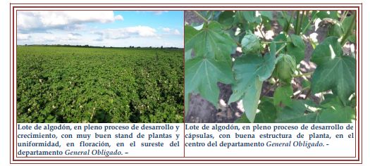detección del daño por el picudo, b) aplicación de insectisidas, herbicidas y en cierto porcentaje de los lotes, reguladores de crecimiento del cultivo, c) seguimiento de los cultivares y observación de daños por orugas. En el área algodonera oeste, departamento Nueve de Julio, distrito Santa Margarita, centro y sur del distrito Los Saladillos y este del distrito Villa Minetti, ante los excesos hídricos, período húmedo, encharcamiento y anegamientos, la pérdida del cultivo sería total, abarcando aproximadamente unas 7.000 a 7.500 ha aproximadamente.