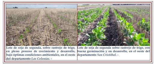 Las actividades de siembra fueron bajas, solo durante dos días soleados, bajo buenas condiciones climáticas, interrumpidas por precipitaciones, que condicionaron la cama de siembra. La estimación de intención de siembra de unas 550.000 ha, con un incremento del 6,36 % representando unas 35.000 ha más, que la intención de la campaña pasada, no se concretaría. Los diferentes escenarios mencionados en los últimos dos informes, con consecuencias e impactos de importancia, fueron las realidades que determinarían la imposibilidad del logro de la intención de siembra prevista. Siendo el área de mayor influencia, la de los departamentos del norte, fundamentalmente Nueve de Julio, por su superficie y grado de afectación climática. Se observaron los siguientes estados fenológicos: V “estados vegetativos” VE (emergencia), Vc (estado de cotiledón, hojas unifoliadas pegadas), V1 (1º nudo), V2 (2º nudo), V3 (3º nudo), V4 (4º nudo) y lotes más avanzados en V5 (5º nudo).