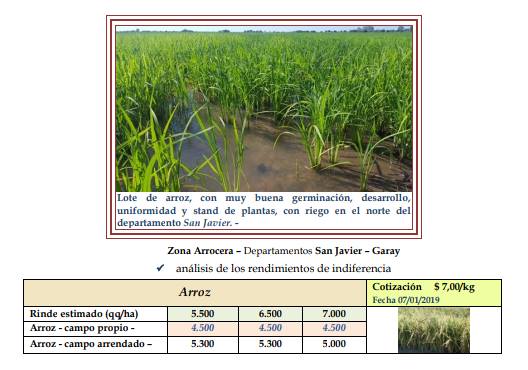 El cultivo de arroz siguió complicado, con las continuas lluvias que se registraron desde mediados de diciembre de 2018, hasta la fecha. A las pérdidas confirmadas de 1.000 ha en los primeros estadios, la evolución continuó siendo irregular. La temperatura en el período favoreció el rápido desarrollo de las variedades alcanzando la floración y posterior llenado de grano. Los lotes más bajos aledaños al Arroyo Saladillo, con drenaje natural de la cuenca, tuvieron excesiva carga de agua, si bien fueron pocos los días que se regó desde río, las bombas para desagote trabajaron en forma permanente para la evacuación de los excesos hídricos. Las bombas funcionaron a gas-oíl, incrementando así el costo del producto. El resto de los lotes se encontraron en estado vegetativo (macollaje – principios de encañado) y reproductivo o (diferenciación). La cosecha comenzaría a principios de febrero en los primeros lotes. Los caminos internos de las arroceras se encontraron en muy mal estado, con muchas dificultades de transitabilidad, lo que demandaría urgentes medidas de reparación en los próximos días. El estado sanitario del cultivo fue bueno en cuanto a enfermedades, pero se detectaron ataques de oruga de hojas y barrenadores. Continuarían las aplicaciones de fertilizantes, cuando las pistas de aterrizaje lo posibiliten. El valor comercial del grano de arroz con cáscara, fue de $ 7,00 /kg quedando igual a las semanas anteriores.