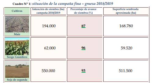 Hasta la fecha el cultivo de maíz presentó un avance en la siembra del 87 %, representando unas 168.780 ha. Unas 89.000 ha correspondieron a los lotes sembrados en primera instancia, denominado maíz de primera, el cual de acuerdo al área de estudio tendría dos usos, un porcentaje a grano para futura venta comercial y el otro porcentaje como forraje, para consumo animal bovino. Otras 79.780 ha a lo sembrado en segunda instancia, denominado maíz de segunda o tardío. El movimiento de sembradoras y de equipos en toda el área, estuvo regulado por las precipitaciones irregulares que se manifestaron y condicionaron la cama de siembra, siendo relativamente baja la superficie sembrada.