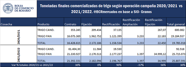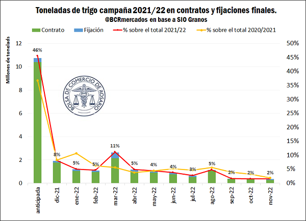 El total de toneladas negociados en Argentina entre diciembre de 2021 y noviembre de 2022 en contratos alcanzó 21,4 millones de toneladas, en tanto que las fijaciones sumaron otros 2,2 millones de toneladas y las rectificaciones 2,2 Mt. Tal como puede apreciarse en el cuadro que sigue, en comparación con la campaña anterior, el volumen de toneladas en contratos aumentó un 30%, mientras que el volumen de fijaciones permaneció constante.