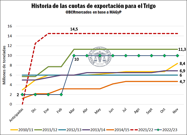 Debe considerarse que, hace un año atrás, se reintrodujeron los “volúmenes de equilibrio”, o cupos a la exportación del cereal. En un inicio, se estableció en el mes de diciembre de 2023 un “volumen de equilibrio” de 12,5 Mt, para luego ampliarlo en enero de 2022 a 14,5 Mt. El establecimiento de estos volúmenes generó una “competencia por los cupos”, haciendo que las empresas exportadoras se apuraran por registrar operaciones y generando una alteración en el flujo de negocios.