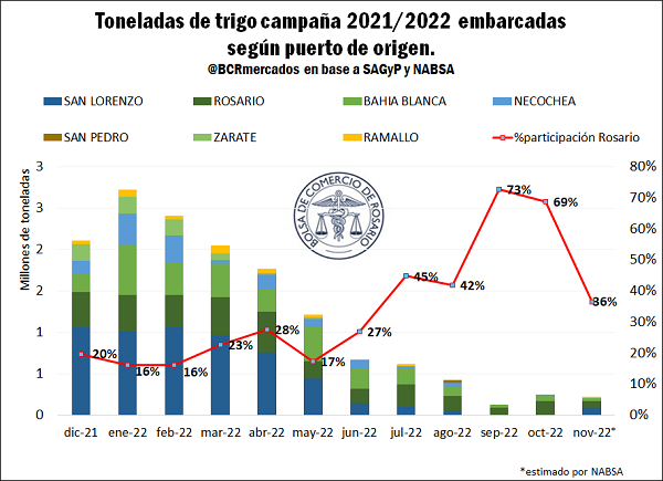 En cuanto a embarques, como resulta habitual, la mayoría se concentró en los primeros meses luego del inicio de la campaña. En total, se despacharon al exterior aproximadamente 14.555.175 millones de toneladas de trigo, de las cuales el 62% partieron desde las terminales portuarias del Gran Rosario.
