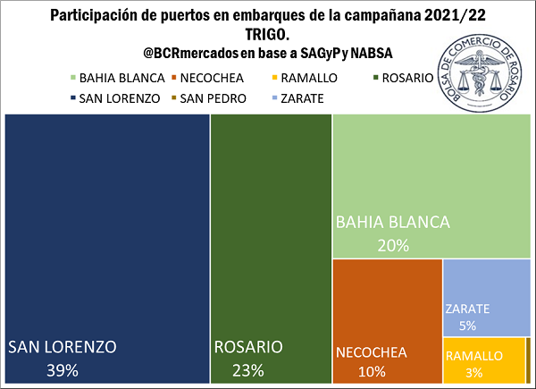 El segundo nodo portuario más importante en participación de embarques de trigo fue Bahía Blanca, con el 20%, en tanto que Necochea/Quequén cierra el podio con el 10%.