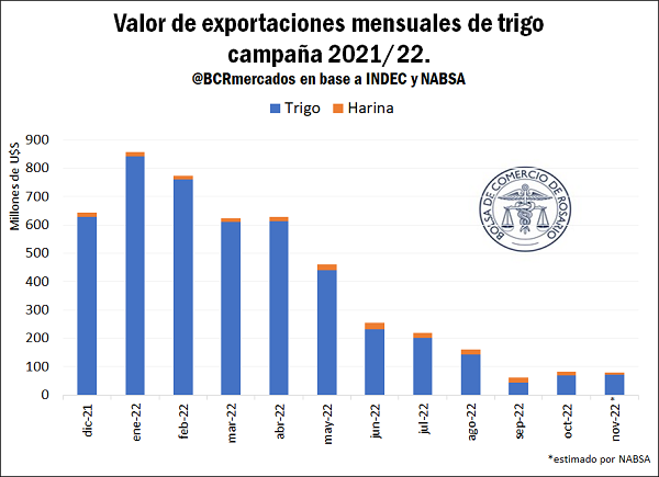 Respecto del valor exportado de la campaña por parte del complejo trigo, hubo ingresos por aproximadamente U$S 4.844 millones, de los cuales el trigo como grano aportó el 96%, y el resto fue compuesto mayoritariamente por harina de trigo.