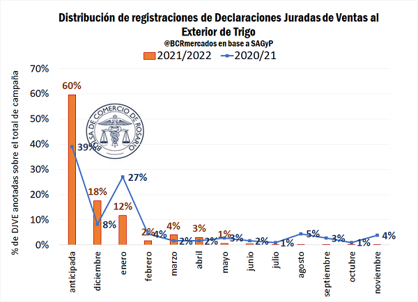 De acuerdo con los datos presentados por SAGyP, el volumen de Declaraciones de Ventas al Exterior de trigo para la campaña 2021/22 alcanzó un total de 15.245.744 toneladas. La mayor proporción de las ventas (el 60%) correspondieron a operaciones anticipadas; es decir, previas a diciembre 2021, en tanto que, a diferencia del año anterior, el segundo pico estacional se registra en diciembre y no en enero. En ambos casos, desde febrero en adelante las ventas al exterior son relativamente marginales, y se corresponden mayormente con operaciones de exportación a Brasil.