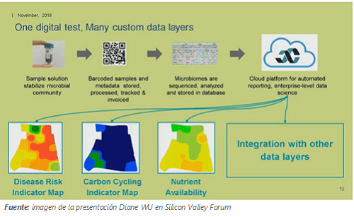 Trace Genomics se dedica a descubrir el “ADN del suelo” mediante el estudio del microbioma para adelantarse a posibles amenazas antes de que sean visibles en el campo. A partir de tomas de muestra de suelo, se aíslan los microrganismos, se les extrae el ADN, se secuencia el mismo generando un gran volumen de datos en 2 a 3 semanas y luego se identifica la especie. La información se sube a la nube donde el productor tiene acceso y se combinan con otras capas de información para generar mapas de riesgo de enfermedades, de carbono y nutrientes