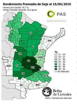 La cosecha cubrió el 76,7 % del área apta y los rendimientos en lotes de segunda mantienen los promedios zonales por sobre las expectativas, permitiendo elevar la proyección de producción a 56 millones de toneladas. Dada la tendencia registrada, la actual proyección hubiera sido aún superior si no fuera por la importante pérdida de área debido a inundaciones registradas en Chaco, Santiago del Estero y extremo norte de Santa Fe.