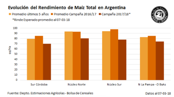 Durante la última semana la cosecha de cuadros de maíz con destino grano comercial continuó en el centro y sur del área agrícola nacional. A la fecha se recolectó el 6,5 % de la superficie apta con un rendimiento medio nacional de 65,8 qq/Ha. En números absolutos se han recolectado unas 350.000 Ha, las cuales se ubicaron en las provincias de Buenos Aires, Córdoba, Santa Fe y Entre Ríos.