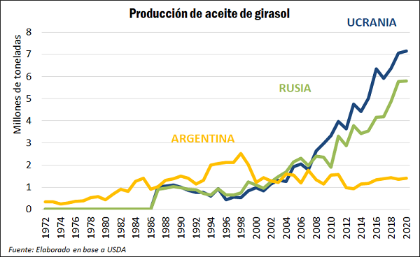 La pérdida de relevancia en el mercado de girasol de Argentina viene a razón de un estancamiento del área sembrada, lo que se traduce en menor procesamiento de semilla de girasol por parte de las plantas aceiteras de Argentina. Hay que tener en cuenta que en el país el girasol cosechado se industrializa prácticamente en su totalidad, y sólo una parte pequeña de la producción de girasol industrial o confitero se termina exportando a diversos destinos. De una producción anual de 1,5 Mt en promedio, la Argentina exporta el 50 % del aceite de girasol, por lo que se estima que en la nueva campaña despachará entre 600 mil y 700 mil toneladas. Esto la coloca por detrás de Ucrania y Rusia, que se espera exporten 6,5 y 3,25 Mt, respectivamente.