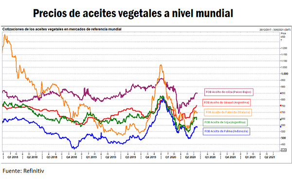 Por otro lado, hay que tener en cuenta que los aceites vegetales también son utilizados para hacer biodiesel, por lo tanto se encuentran impactados por la cotización del barril de petróleo. La caída del precio del hidrocarburo a principios de año impuso presión a la cotización de todos los commodities pero principalmente de los aceites que compiten con los derivados del combustible fósil. De este modo, por caso, el aceite de soja acusó el golpe de la menor demanda de energía, en tanto que el aceite de girasol resultó relativamente indemne. Otro factor coyuntural que afecta a los precios es la caída en el nivel de actividad mundial producto del COVID-19. A pesar de esto último, sin embargo, se espera que en el año 2020 continúen aumentando las importaciones de aceites pasando de 80 Mt en 2019 a 82 Mt en 2020, según el USDA. En el comercio de vegetales mundial se espera que el crecimiento provenga principalmente de economías emergentes, lideradas por India y China que importarían 15,1 y 11,4 Mt en 2020 respectivamente.