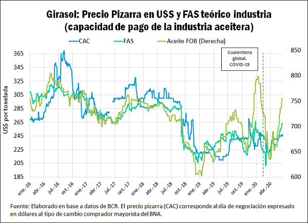 Respecto a los precios de exportación del aceite de girasol FOB spot se ha notado una recuperación importante luego de la caída inducida por la cuarentena global del COVID-19 y la caída en el precio del petróleo. El promedio de puntas compradoras y vendedoras del aceite de girasol ganó más de 100 USD/tn cotizando en la última semana alrededor de los 750 USD/tn. El FAS teórico de la industria aumentó a la par de las mejoras en el aceite de girasol. Si esta tendencia continúa se esperaría una mejora en los precios del girasol pagados al productor.