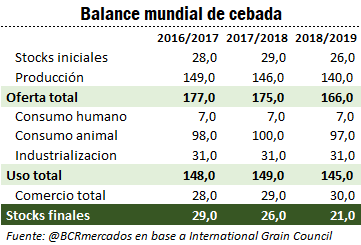 Como puede verse en el cuadro correspondiente, la producción mundial de cebada de la campaña 2018/2019 podría ubicarse en 140 Mt con un stock inicial de 26 Mt siendo la oferta total de 166 Mt. Por el lado de la demanda, consumo animal descendería a 97 Mt, mientras que el comercio aumenta a 30Mt. El consumo humano permanecería estable en 7 Mt y se industrializarían una 31 Mt. Por lo tanto, el balance arrojaría un stock final de 21 Mt, cayendo 5 Mt respecto al ciclo previo.