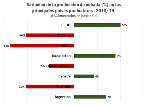 Las condiciones climáticas adversas en esta campaña afectaron a cuatro de los principales productores de cebada del mundo (Rusia, Australia, Ucrania y la Unión Europea) y no fue compensada por la mayor producción del resto de los países. Se destaca Rusia con una caída en su producción del 13,7% para ubicarse en un total de 17,4 Mt. El mayor productor de cebada es la Unión Europea con un aporte de 55,8 Mt de producción, marcando una caída anual de 5,4% por falta de agua en la zona norte de Europa y Alemania.
