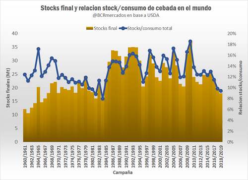 Según las cifras del Consejo Internacional de Cereales, las existencias finales del ciclo 2018/19 de cebada a nivel mundial marcarían por segundo año consecutivo un nuevo record. Los stocks se retraen a la cifra más baja desde la campaña 1995. La combinación de una caída en los rindes y la calidad de los granos junto a una renovada demanda por parte de China impulsan a la cebada a un escenario alcista en los precios.