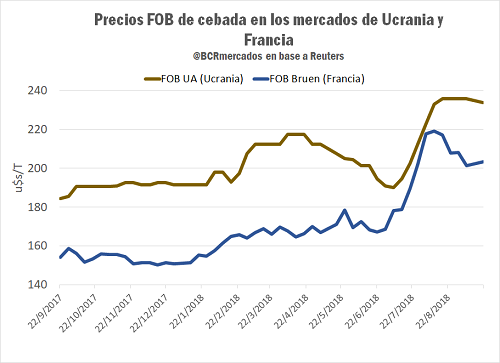 Ante este escenario, los precios fueron traccionados al alza. El siguiente gráfico muestra la evolución del último año de los precios de exportación de cebada en los principales mercados. Respecto a septiembre del año pasado, en el mercado de Rouen (Francia) el precio aumento 49 u$s/t para ubicarse en 203,2 u$s/t. En tanto, en Ucrania (Región del Mar Negro) el aumento fue de 49,5 u$s y se posiciona en 234 u$s/t. Subas importantes que generan un alto atractivo para este cereal.