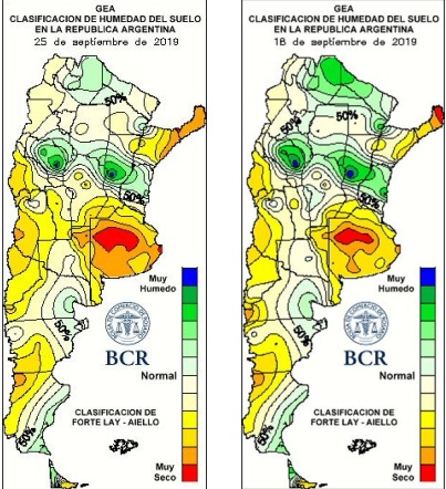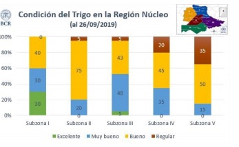 Los técnicos ya notan síntomas de estrés hídrico por la alta demanda atmosférica. Los días más largos y las mayores temperaturas en los momentos en los que el trigo necesita más agua ponen al cultivo en una situación difícil. Las lluvias del 8 al 12 de septiembre son las que conservan la condición de los trigos del centro sur de Santa Fe y los del este de la región. Pero en el oeste de la región no contaron con ese auxilio y se estiman