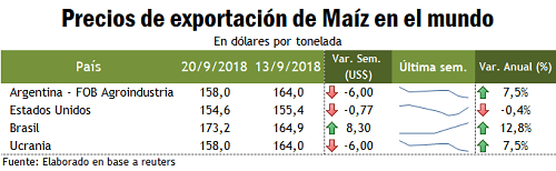 El precio del maíz local en el mercado disponible aumentó US$3,72/t en los últimos 7 días, mientras que los futuros negociados en MATba terminaron en baja. En este mercado, el precio mantuvo una senda declinante alcanzando nuevos mínimos en los contratos al día martes 18. Al jueves 20 de septiembre, los precios pudieron recuperar terreno, todo esto siguiendo el precio que fija el mercado de Chicago. A pesar de la recuperación en los últimos días, la caída semanal de entre US$1,5/t y US$3,50/t en las posiciones diferidas de MATba fue consecuente a los menores precios de exportación en el mundo, salvo Brasil. Este movimiento de precios estuvo ligado a los vaivenes del precio estadounidense, siendo que gran parte de la cosecha en curso del cereal, con rindes que se esperan récord, inminentemente se abalanzará sobre los mercados internacionales aplacando los precios.