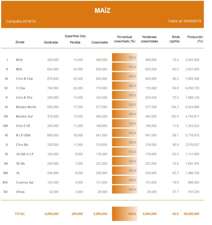 La cosecha culminó en toda la provincia de Córdoba con excelentes rendimientos, tanto en cuadros tempranos como tardíos. Los mayores rindes se relevaron en los departamentos de Marcos Juárez y Unión, con productividades superiores a los 100 qq/Ha En la zona Centro-Norte de Santa Fe culminó la cosecha con un rinde promedio de 72 qq/Ha y 13.500 Ha perdidas producto de los excesos hídricos. Hacia las zonas Oeste de Buenos Aires-Norte de La Pampa, Cuenca del Salado y el Centro de Buenos Aires la recolección culminó con rindes por sobre los relevados la campaña previa. Por último, en la zona NEA aún se registran cuadros puntuales en pie en el sur de la región, sin embargo el resultado de estos lotes no modificará nuestra actual estimación de producción nacional.