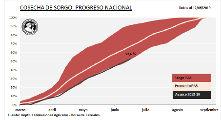 La mejora parcial en las condiciones del tiempo, permitió que la cosecha de lotes de sorgo granífero avance sobre planteos tardíos y de segunda ocupación. A la fecha, el avance de cosecha ya se ubica en 52,6 % de las 730.000 Ha implantadas la campaña en curso. Las labores se encuentran más adelantadas en el centro del área agrícola nacional, particularmente en la provincia de Córdoba y Santa Fe. En el extremo norte del país, la elevada humedad de los granos y la falta de piso mantiene una demora de 20 puntos porcentuales en la recolección en comparación a la campaña previa.