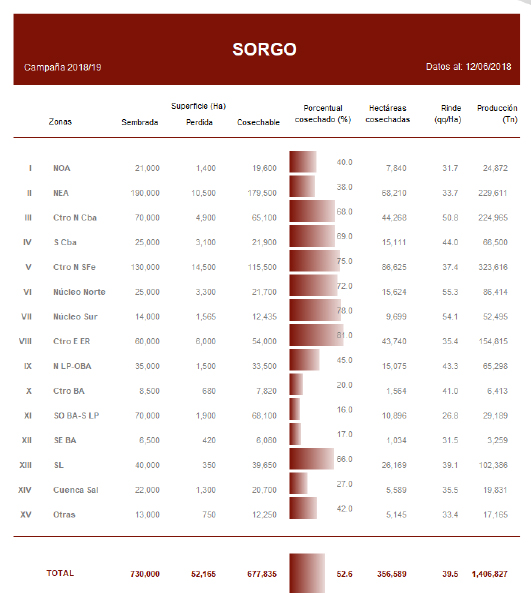 En la zona del NOA, el rinde medio se ubica en los 31,7 qq/Ha luego de cosecharse cerca de 8.000 Ha del cereal. En la provincia de Córdoba, las labores comienzan a tomar impulso en los departamentos del norte y este provincial. En el sur del área agrícola nacional, la elevada humedad de los granos aún mantiene la demora en las labores de recolección de sorgo granífero. Sobre la región del Centro-Norte de Santa Fe, las más de 86.000 Ha cosechadas brindan un rinde medio de 37,4 qq/Ha.