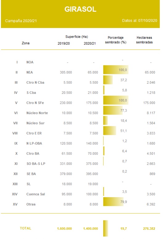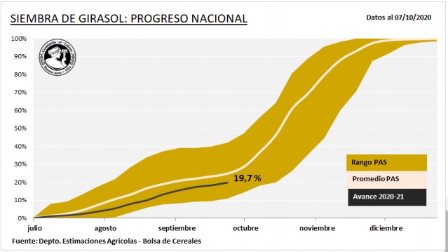 La siembra ha progresado 1,5 puntos porcentuales, alcanzando a cubrir el 19,7 % de las 1,4 MHa estimadas para esta campaña. A la fecha se mantiene una demora interanual de -16,4 pp.