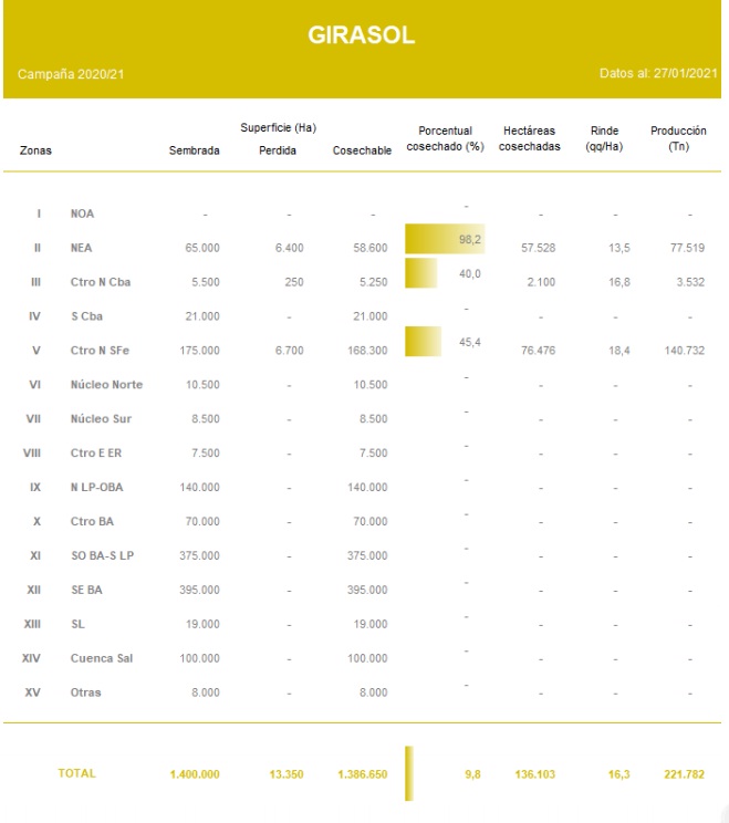 Sobre la franja norte del país, en la región NEA, debido a las lluvias de los últimos días, el progreso de la recolección fue de solo 4,4 puntos porcentuales. No obstante, solo resta menos del 2 % del área apta para finalizar la cosecha. El rinde promedio regional a la fecha se ubica en 13,5 qq/Ha, con registros puntuales que van de 7 a 21 qq/Ha.