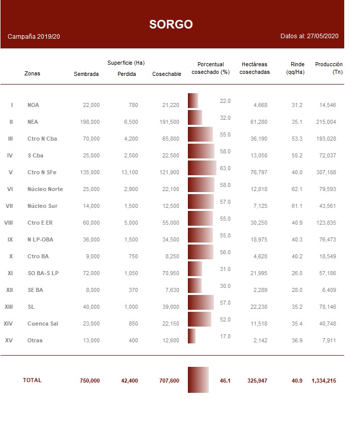 En el Centro-Norte de Córdoba, la recolección se ubica en el 55 % del área apta, entregando un rinde promedio de 53,3 qq/Ha. Hacia el Sur de Córdoba la cosecha mantiene un adelanto de 7 puntos porcentuales en comparación al ciclo previo.