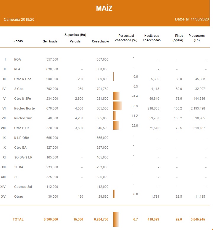 Durante la última semana la cosecha de maíz con destino grano comercial avanzó a buen ritmo sobre los planteos tempranos. La importante baja en la humedad de los granos permite acelerar las labores en el centro del área agrícola.
