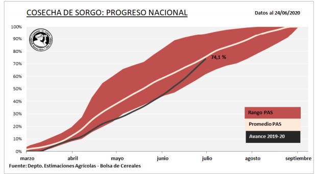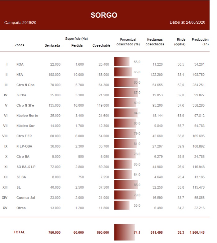 Luego de finalizada la cosecha de soja en toda el área agrícola nacional, los productores priorizan la recolección de cereales de verano. La importante baja en los niveles de humedad registrada durante el último mes, promovió la aceleración en las labores sobre los cuadros de sorgo incorporados durante el inicio de la ventana de siembra. Hacia las zonas Oeste de Buenos Aires-Norte de La Pampa, Cuenca del Salado y el Centro de Buenos Aires la cosecha avanza a buen ritmo, registrando rindes cercanos a las expectativas iniciales. En el Centro-Norte de Córdoba, el rinde medio cae hasta los 52 qq/Ha. En la zona del NEA, la baja en la humedad de los granos permite que la recolección se ubique en el 65 % del área apta. En la región Centro-Norte de Santa Fe, el rinde medio de 37,6 qq/Ha permite acumular una producción parcial de casi 360 mTn.